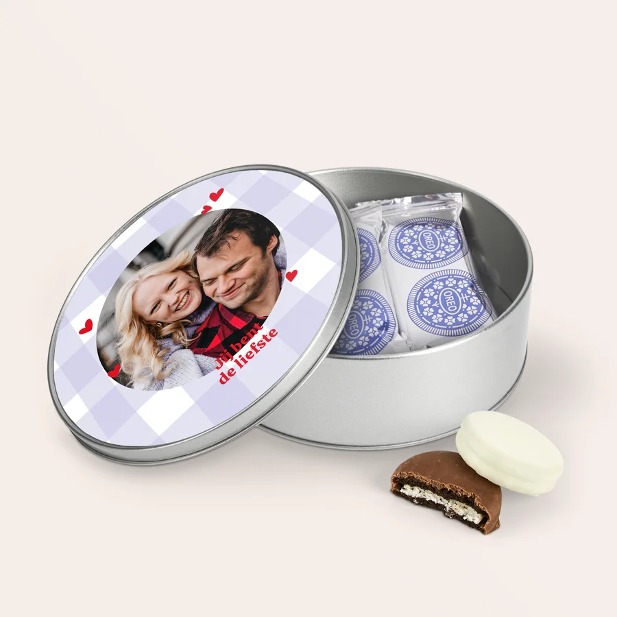 Op zoek naar een origineel cadeau voor Moederdag, Valentijnsdag of gewoon zomaar? Dit ronde koekblik is niet alleen gevuld met onweerstaanbare chocolade-Oreo’s, maar wordt ook bedrukt met een persoonlijke foto en/of naam op het deksel. Je kunt zelfs een gratis cadeaukaartje met een lieve boodschap toevoegen.