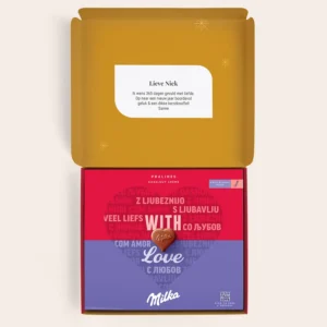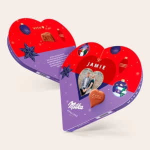 €16.95Een persoonlijk Milka hart – het lekkerste cadeau onder de kerstboom Productinformatie Chocolade: hartvormige chocolade pralines Vulling: hazelnoot-nougat crème Gewicht: 187 gram Afmetingen: 24 x 25,5 cm Personalisatie: met foto, naam en boodschap Bedrukking: haarscherp en full colour Ingrediënten Suiker, cacaoboter, palmolie, cacaomassa, weipoeder (van melk), magere melkpoeder, melkvet, 5% hazelnootpasta, emulgatoren (sojalecithinen, E476), aroma’s…