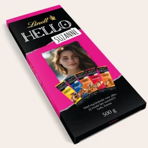 De Mega Lindt Hello chocoladereep – Persoonlijk en boordevol smaak Productinformatie Afmetingen: 58,6 x 23,4 x 2,1 cm Inhoud: 5 x 100 gram (Caramel Brownie, Cookies & Cream, Strawberry Cheesecake, Crunchy Nougat, Salted Caramel – inhoud kan variëren) Personalisatie: met naam, foto en/of tekst Bedrukking: haarscherp en full colour Let op: bij temperaturen boven de…