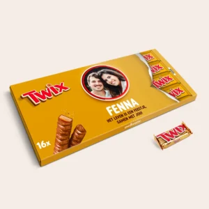 Mega Twix Reep – Met Naam, Foto en Tekst Cadeauspecificaties Inhoud: 16 repen Twix Gewicht: 16 x 50 gram Afmetingen: 59,5 x 26,7 x 2,9 cm Personalisatie: naam, foto en/of tekst Bedrukking: haarscherp en full colour Ingrediënten Twix reep: suiker, glucosestroop, TARWEMEEL (17%), palmvet, magere MELKPOEDER, cacaoboter, cacaomassa, botervet (van MELK), LACTOSE, weipermeaat (van MELK),…